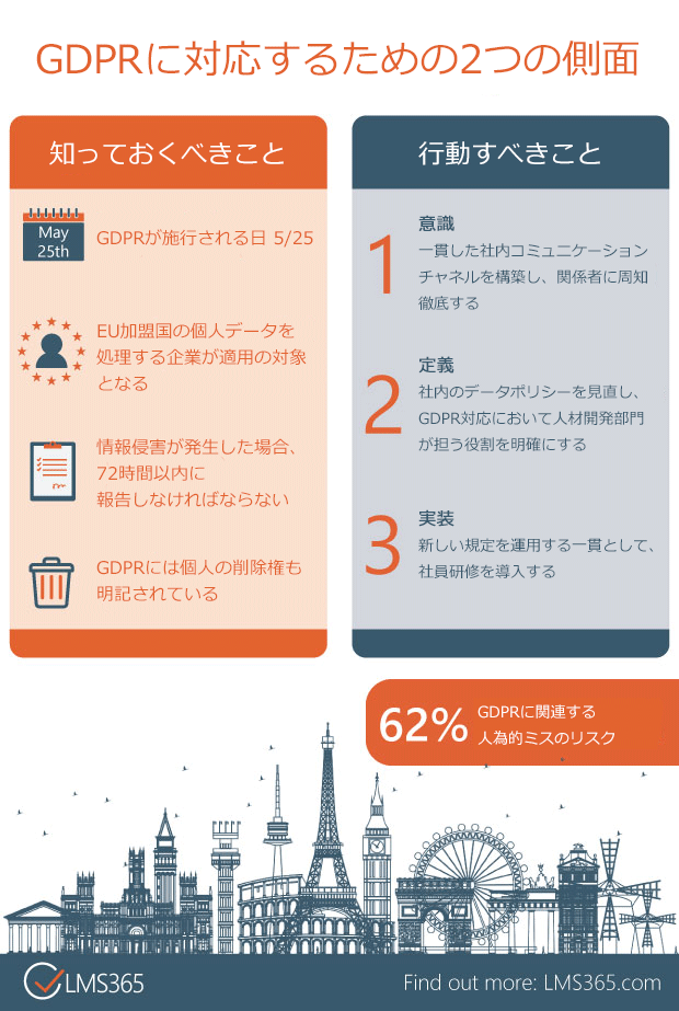 GDPRに対応するための2つの側面 投稿日 2018年5月8日 更新日 2021年8月31日 著者 sofia カテゴリー コラムLMS365インフォグラフィックEU一般データ保護規制(以下、GDPR)は、EU加盟諸国の個人データ保護を強化することを目的とした新しいプライバシー保護法です。本規則は2018年5月25日に施行されます。 多くの企業が規則の遵守に向けて速やかな対応の準備を推進しています。 この機会に、GDPRの遵守にむけた準備を始めてはいかがでしょうか?この記事を書いた人 sofia 記事一覧