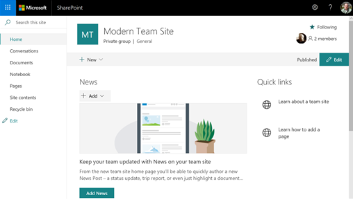 SharePointの新しいチームサイトは柔軟に設計されており、利用者の視点からナビゲーションをすばやく作成することができます。