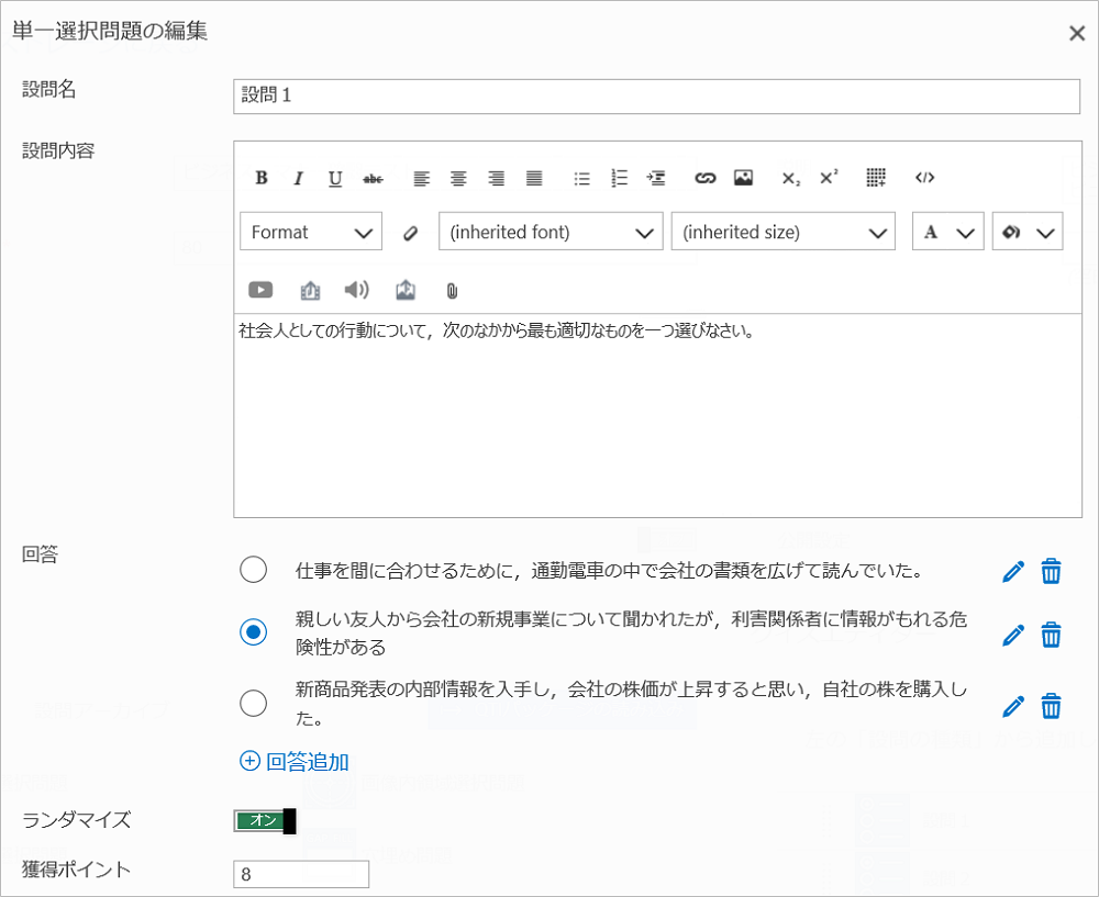 教材ごとに、受講者がこの教材に取り組める回数の制限や、合格点の設定、また、作成した設問を指定した通りに受講させるのか、ランダムに設問表示させるのかなどを設定することが出来ます。