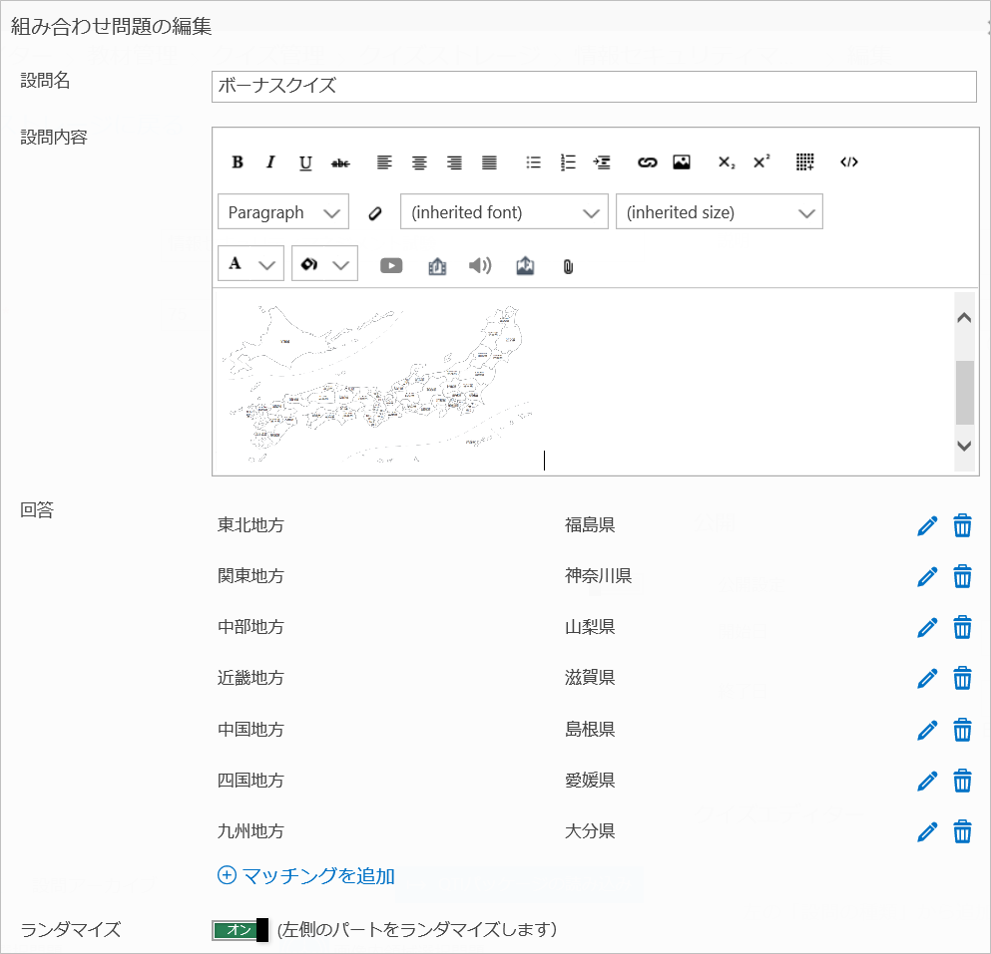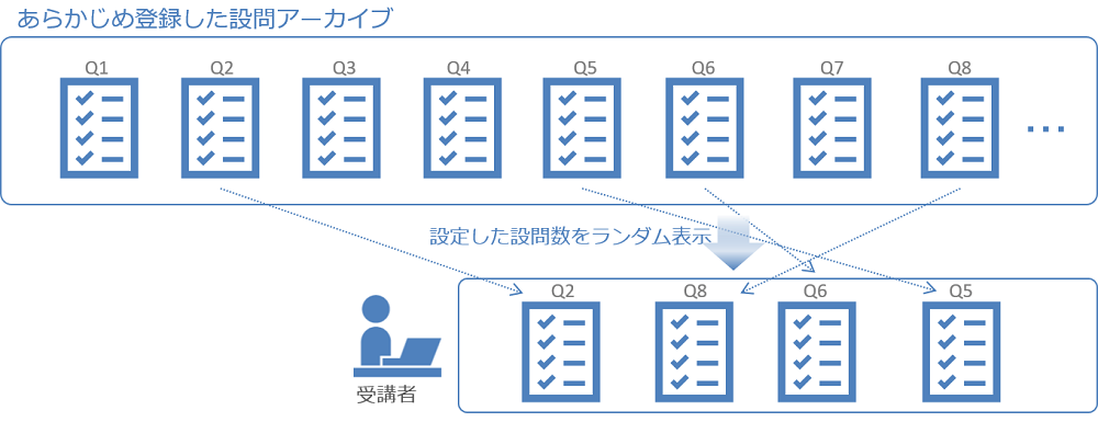 その際、設問アーカイブに登録されている全設問を出題対象にするのか、もしくはそのうちの数問をランダムに抽出して受講者に出題するかを選択することができ、テスト教材を受講者に配信する時の条件にバリエーションを持たせることが出来ます。