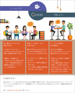 当社は“インターナルコミュニケーション”の観点から、企業と従業員双方のニーズに寄り添い、企業価値を高めるさまざまなソリューションを提供しています。LMS365のご提供のみならず、「グループウェアと連携する唯一のeラーニングシステム」と集合研修とを組み合せ、新しい働き方にフィットした人材育成施策をご提供しています。