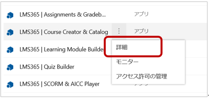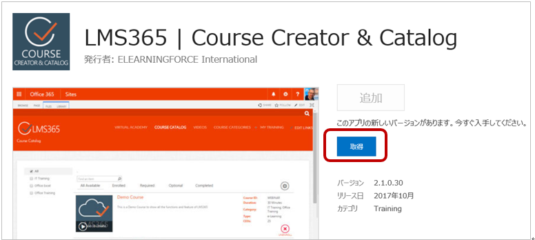 4.歯車メニューより[サイトコンテンツ]を選択し、「LMS365 | Couse Creator & Catalog」の[詳細]を開き「取得」ボタンをクリックします。