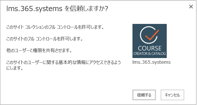 5.アプリの権限を確認する画面が表示されますので、[信頼する]もしくは[OK]ボタンをクリックしてください。