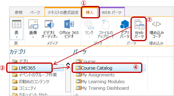 8.コースカタログWEBパーツを利用しているページへ移動し、歯車メニューより[ページの編集]→[挿入]→[Webパーツ]→[LMS365]→[Course Catalog]を選択して、既存のWebパーツとの入替えを行ってください。