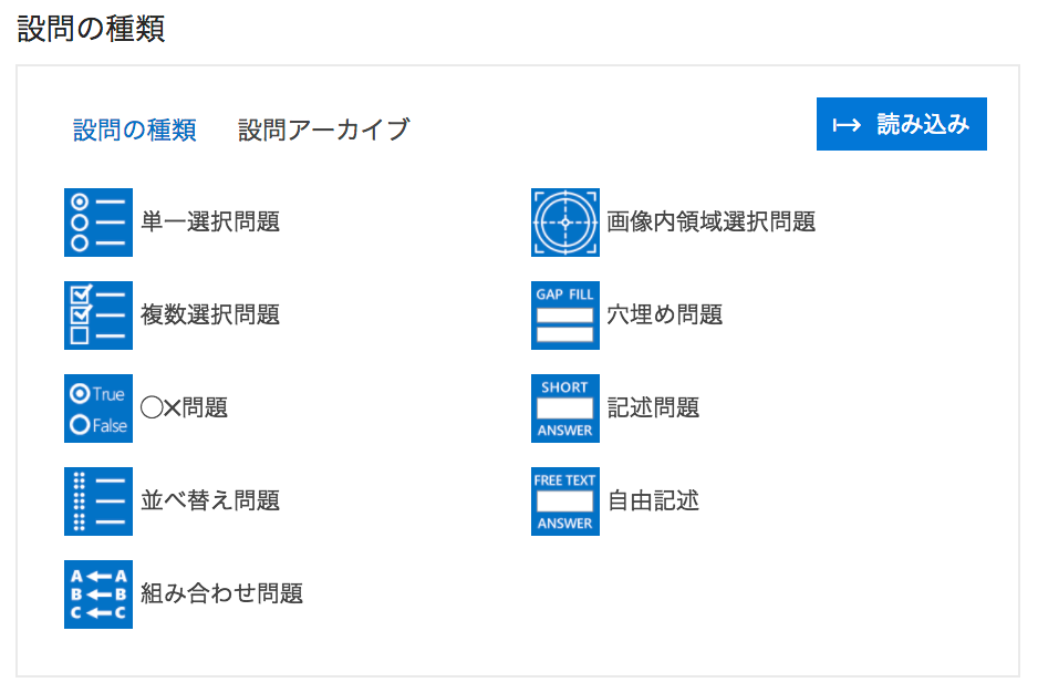 - クイズの種類が、従来の「単一選択」、「複数選択」、「〇×」、「並べ替え」、「組み合わせ」に加え、次の種類が追加されました