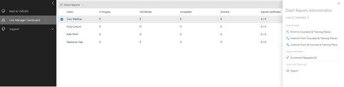 管理者ダッシュボードではライン管理者が管理している受講者の概要を確認することができます。受講者を選択して、受講の登録、受講登録の解除、承認申請の確認及び回答 、トレーニングのインポートが可能となります。