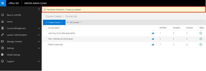 LMS365 管理センターにて、LMS365管理者に、新しい機能や今後の更新・変更に関する情報をお届けします。